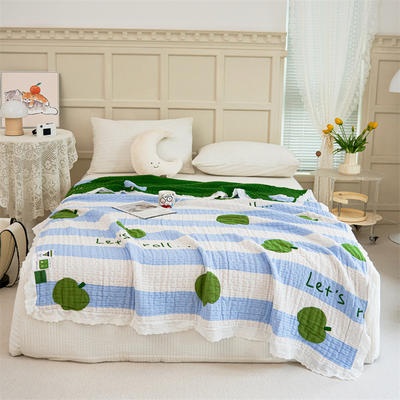 - 2025新款A类全棉三层色织提花纱布日系纱布毯三件套 彩条纹蓝