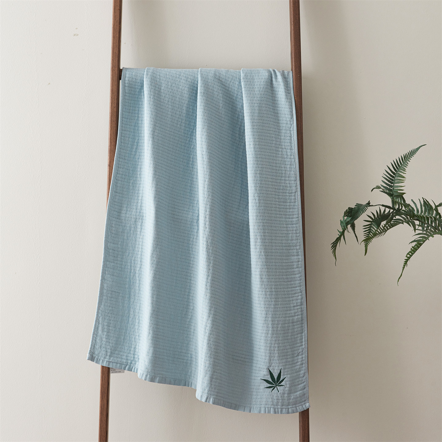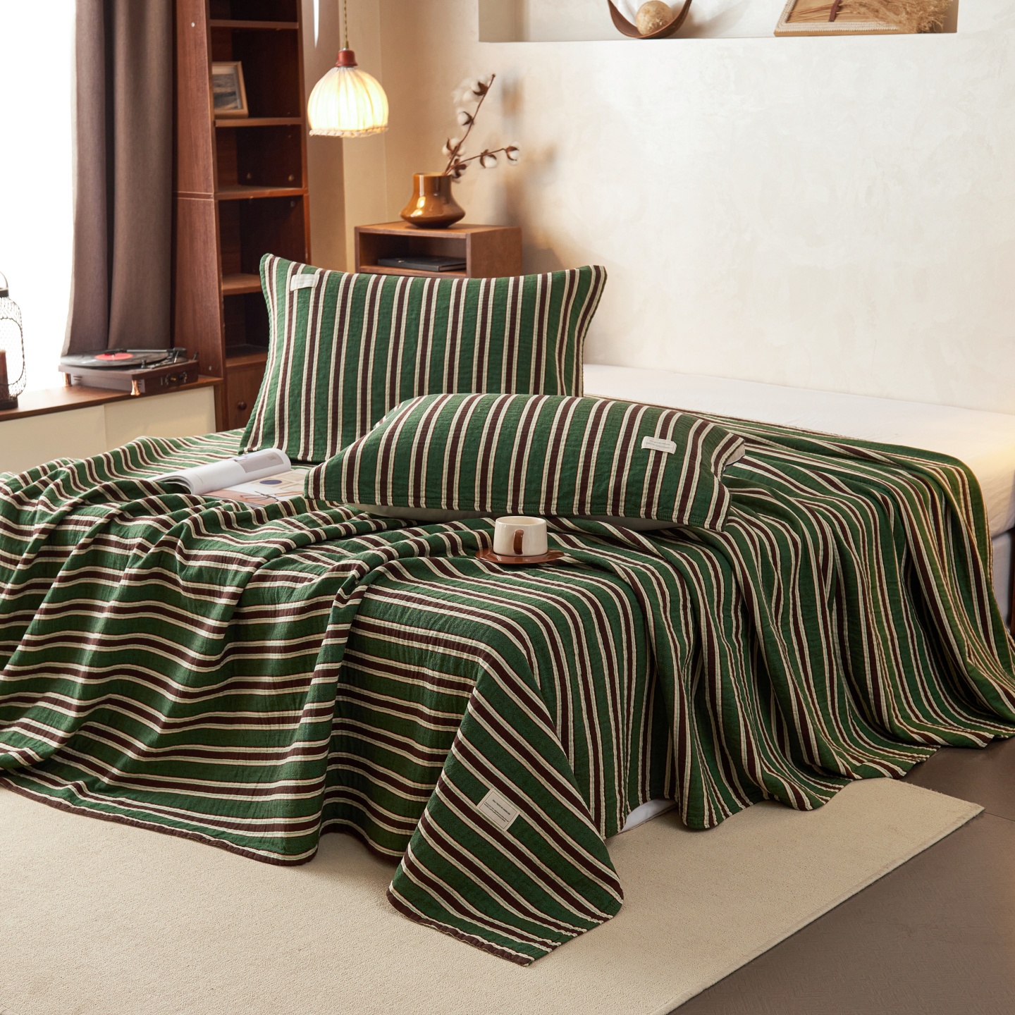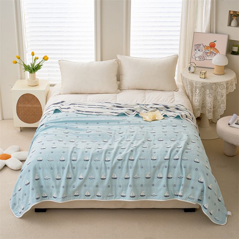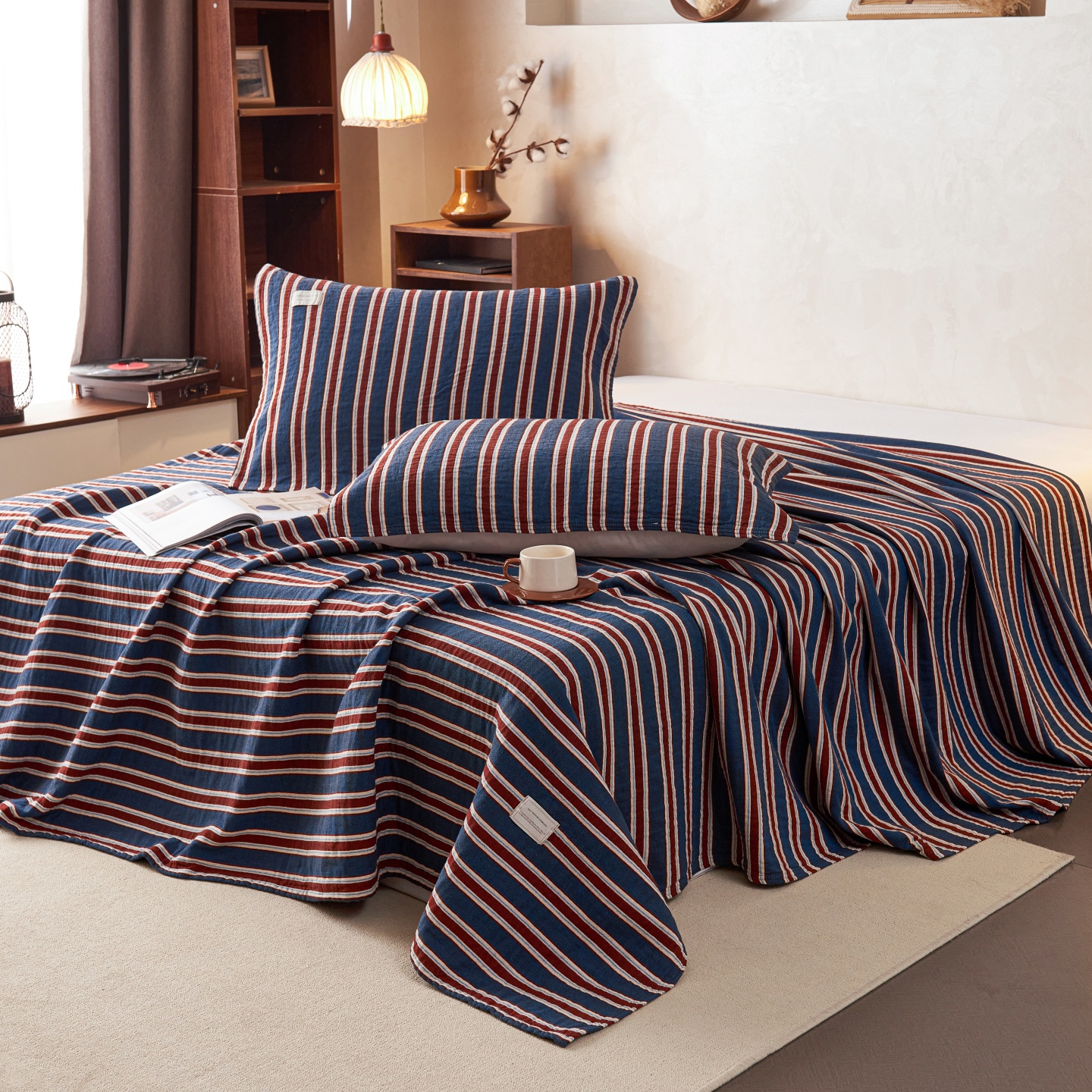 - 2025新款A类全棉三层色织提花纱布日系纱布毯三件套 彩条纹蓝